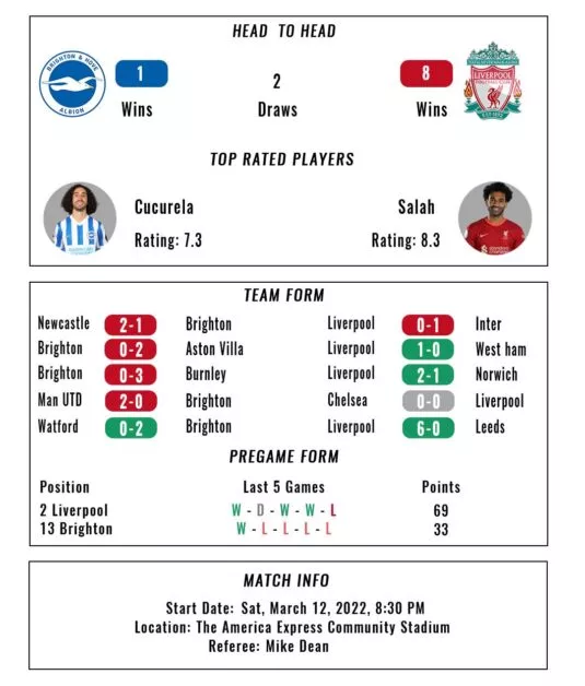 Les Seagulls se sont inclinés 2-1 face à Newcastle United lors de leur dernière sortie, tandis que l’équipe de Jurgen Klopp a validé son billet pour les quarts de finale de la Ligue des champions en milieu de semaine.