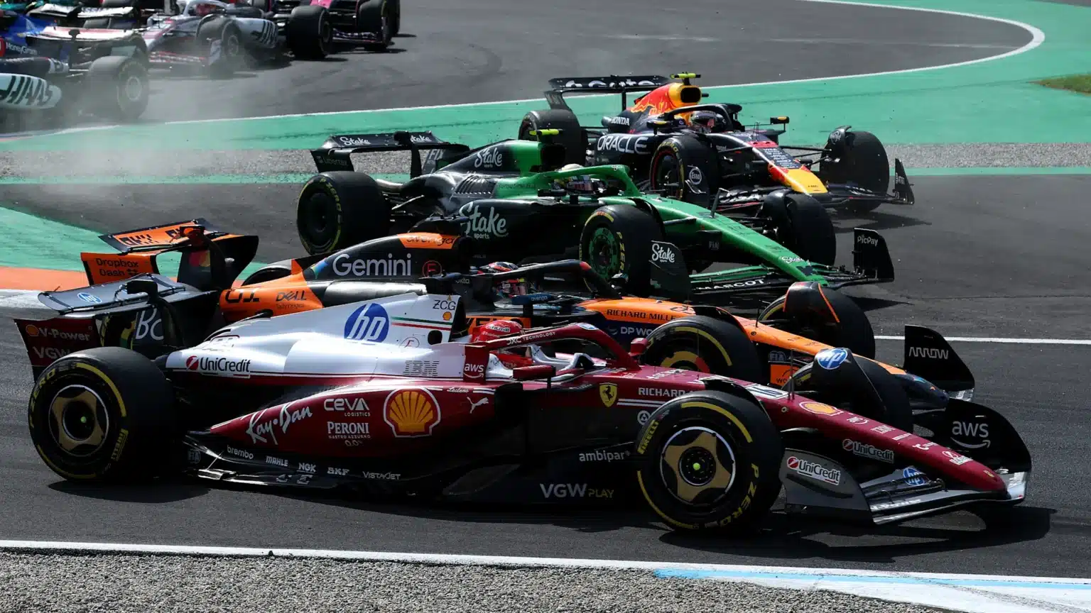 Both McLaren drivers enjoyed tussles off the line at Monza, with Norris edged onto the grass and just keeping his car in track. He inherited the lead when Verstappen ceded position having gone off track, but was unable to keep the quicker Red Bull at bay. Piastri meanwhile had to fight back past Leclerc not once but twice. From there, they looked set to finish second and third behind the dominant Dutchman, only for the team to take the unusual step of pitting Piastri first. Norris pitting second had a slow stop that put him behind his team mate, with McLaren enacting team orders to swap them back around – which is where they came home.