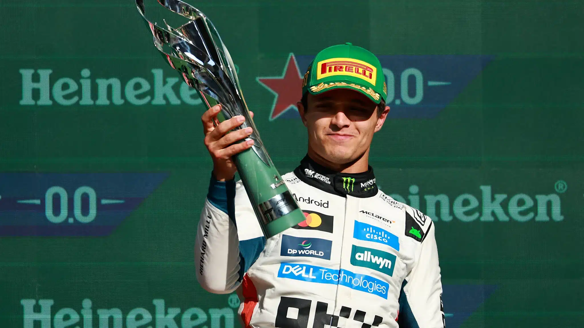 Après avoir décroché une solide pole position lors de la séance de qualification de samedi, Norris a réalisé un bon départ pour conserver la tête – malgré les deux Ferrari et le Taureau Rouge de Max Verstappen à ses côtés dans le virage 1 – et à partir de là, il est resté incontesté en tête.