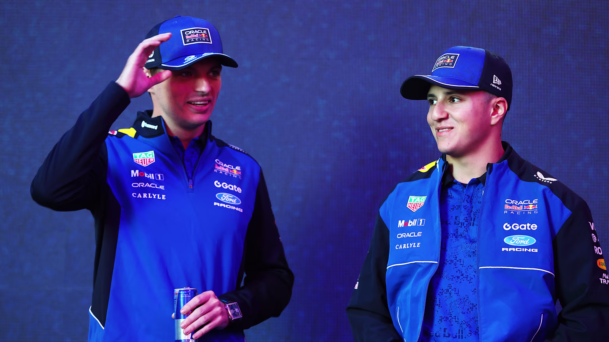 DETROIT, MICHIGAN - 15 JANVIER : Isack Hadjar de France et Oracle Red Bull Racing, Max VerstappenMekies, Verstappen et la nouvelle recrue Isack Hadjar étaient présents au lancement de la livrée Red Bull 2026 à Détroit