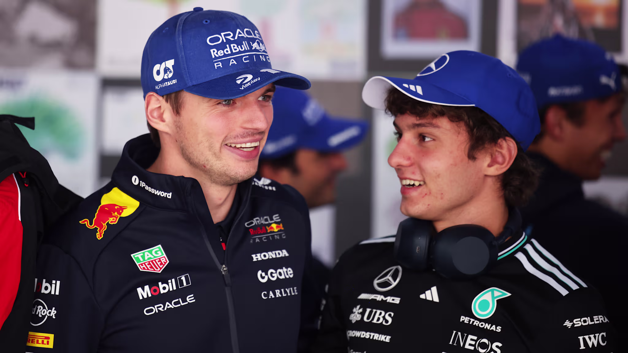 BAHREÏN, BAHREÏN - 11 FÉVRIER : Max Verstappen des Pays-Bas et Oracle Red Bull Racing etVerstappen et Antonelli partagent de bonnes relations en dehors de la piste